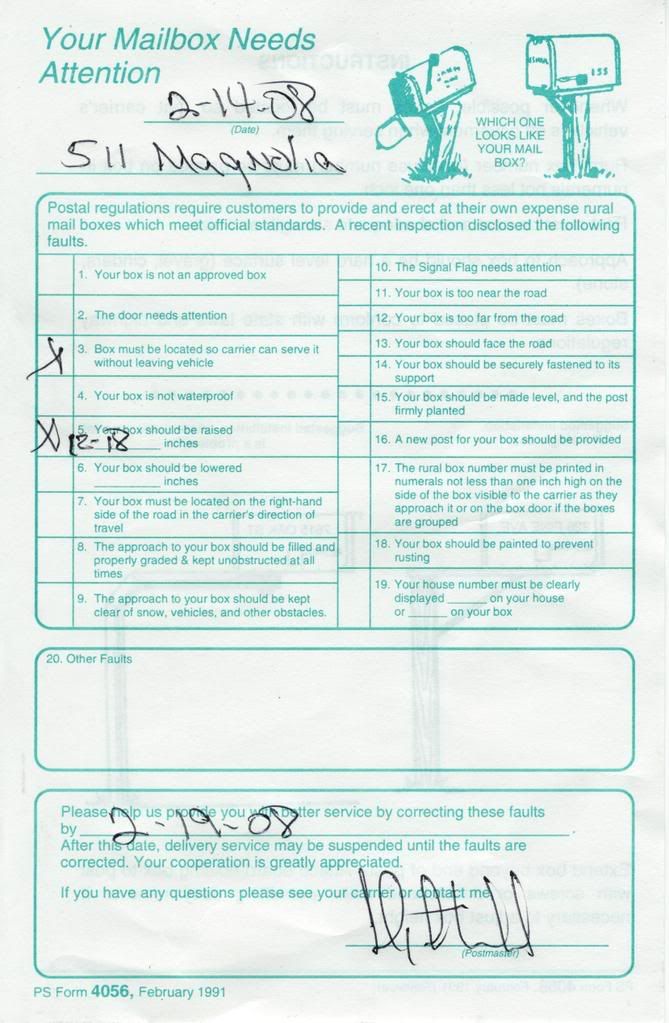 We got an official looking PS Form 4056 from our friendly letter carrier informing us our mailbox was too short. This came as no surprise, but it matched the neighbor's, so we felt no real hurry to replace it. It had been in service for many years, even customized with a wooden pull out drawer Frank made. But it swiveled on its post, and the flag wouldn't stay up, and our mail carrier threatened to stop delivering the mail. (Wait, is it really a threat to say you won't bring my bills to me? Let me think this over.) So we made a run to our neighborhood Lowe's and found one that suited our needs and a nice cedar post that might not rot before someone knocks it over when they misjudge the ice, or the curve, or both. It was probably our easiest home project to date, though at times I was concerned about my proximity to a powered saw blade. Everyone came out intact, and even the mail lady seemed happy Saturday, even though she had to come up the driveway to make her delivery, because we were in the middle of the job.